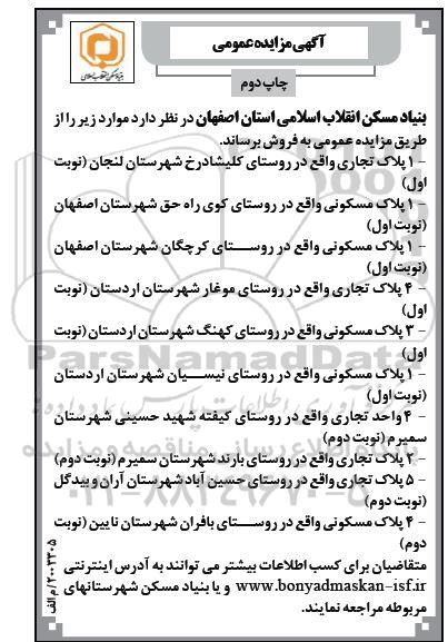 بنیاد مسکن انقلاب اسلامی استان اصفهان در نظر دارد موارد زیر را از طریق مزایده عمومی به فروش برساند.