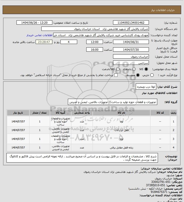 نام دستگاه خریدار:شرکت پالایش گاز شهید هاشمی نژاد استان خراسان رضوی
