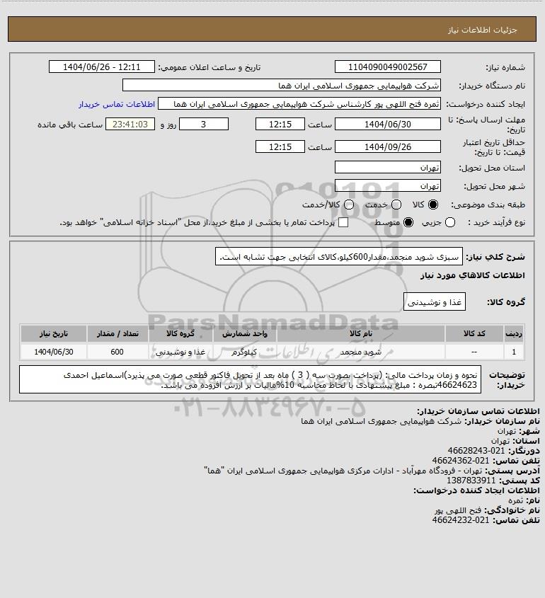 نام دستگاه خریدار:شرکت هواپیمایی جمهوری اسلامی ایران هما