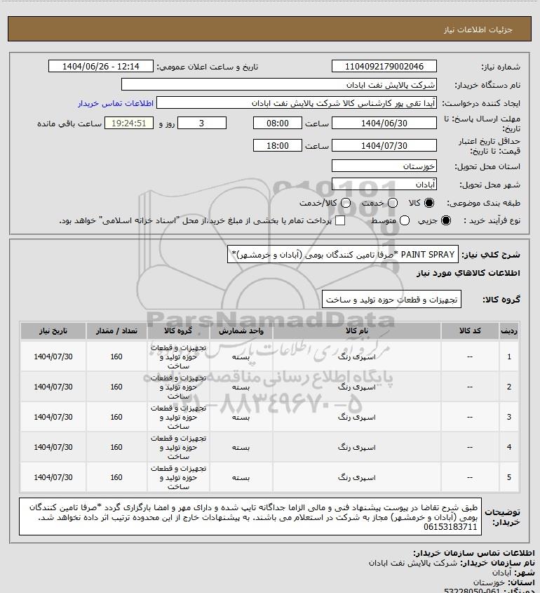شرح کلی نیاز: PAINT SPRAY *صرفا تامین کنندگان بومی (آبادان و خرمشهر)*