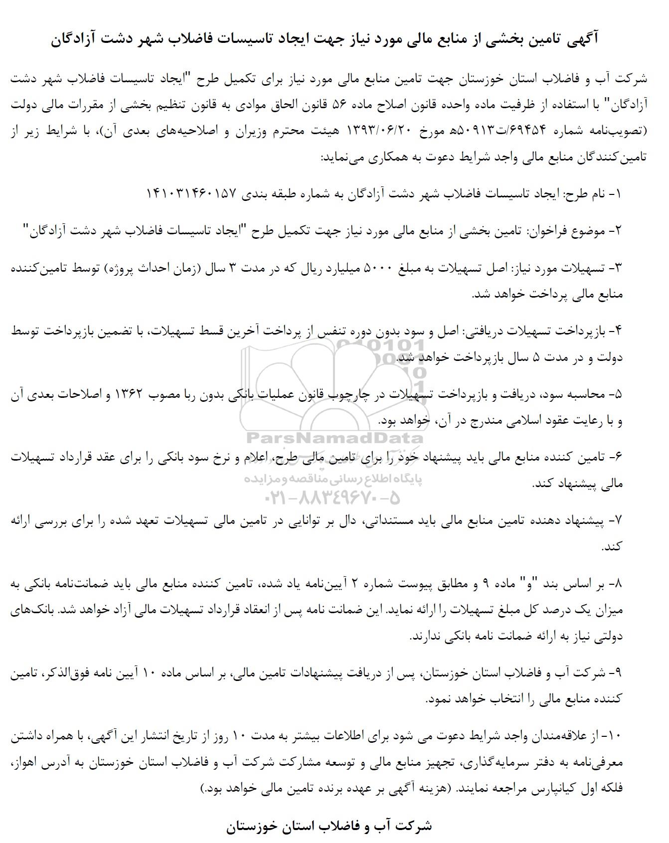 شرکت آب و فاضلاب استان خوزستان جهت تامین منابع مالی مورد نیاز برای تکمیل طرح ایجاد تاسیسات فاضلاب شهر دشت آزادگان با استفاده از ظرفیت ماده واحده قانون اصلاح ماده 56 قانون الحاق موادی به قانون تنظیم بخشی از مقررات مالی دولت (تصویب نامه شماره 69454 ت 550913 مورخ 1393.06.20 هیئت محترم وزیران و اصلاحیه های بعدی آن با شرایط زیر از تامین کنندگان منابع مالی واجد شرایط دعوت به همکاری مینماید