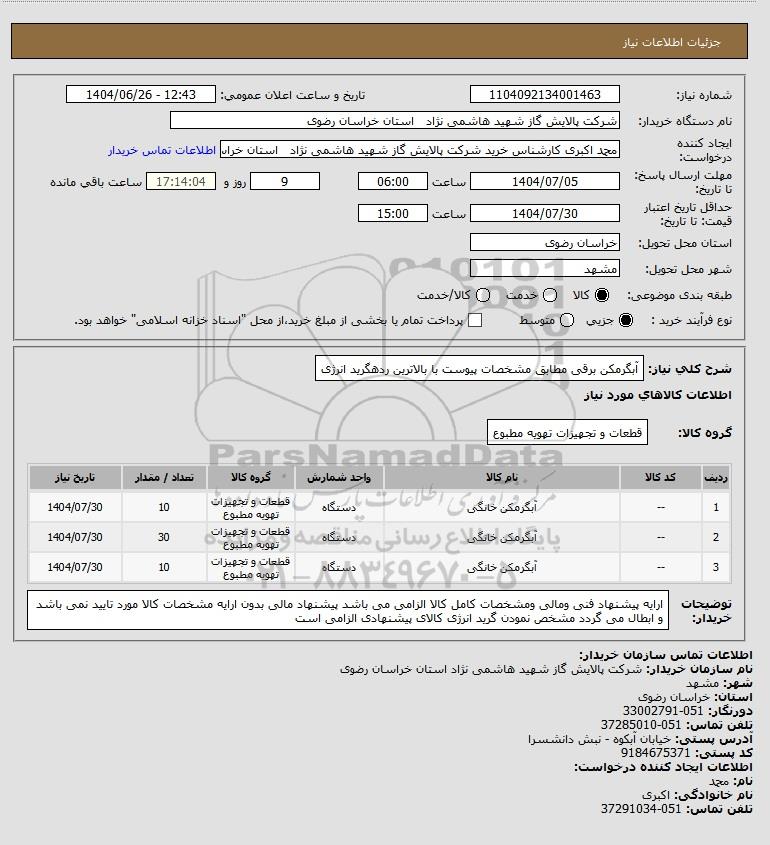 نام دستگاه خریدار:شرکت پالایش گاز شهید هاشمی نژاد استان خراسان رضوی
