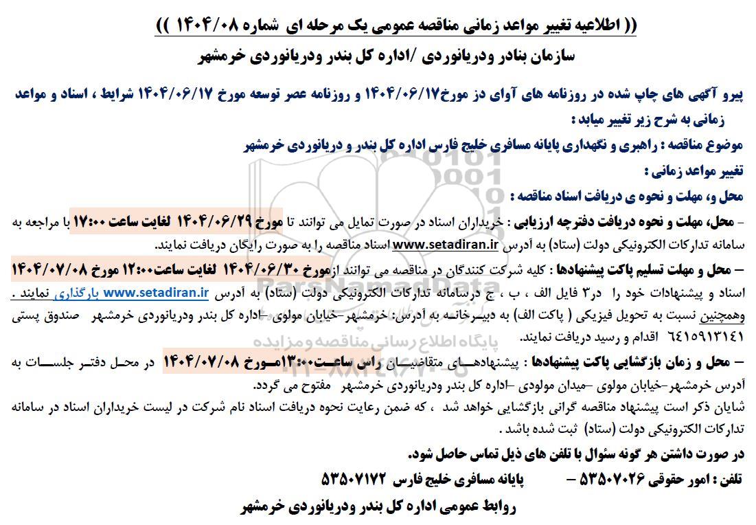 موضوع مناقصه : راهبری و نگهداری پایانه مسافری خلیج فارس اداره کل بندر و دریانوردی خرمشهر