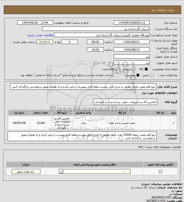 | 1 | -- | پلمپ امنیتی و ضد نفوذ | عدد | ماشین آلات و ملزومات حمل، بسته بندی و نگهداری | 33,000 | 1404/07/28 |