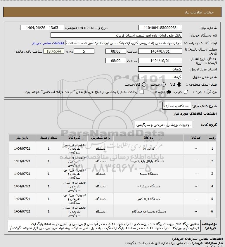 | 6 | -- | دستگاه بدنسازی چند کاره | دستگاه | تجهیزات ورزشی، تفریحی و سرگرمی | 1 | 1404/07/21 |