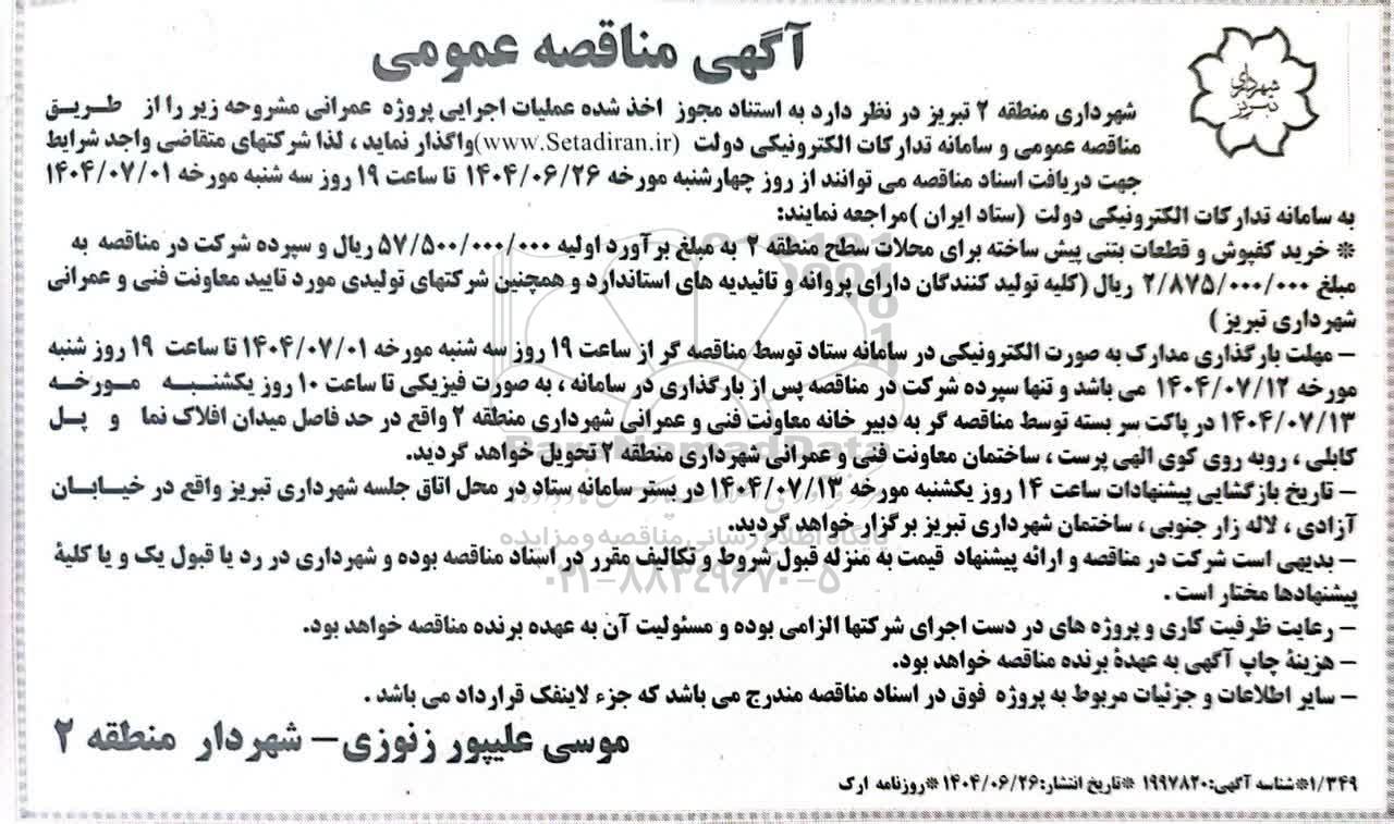 شهرداری منطقه 2 تبریز در نظر دارد به استناد مجوز اخذ شده عملیات اجرایی پروژه عمرانی مشروحه زیر را از طریق مناقصه عمومی و سامانه تدارکات الکترونیکی دولت (ستاد ایران) واگذار نماید لذا شرکتهای متقاضی واجد شرایط جهت دریافت اسناد مناقصه میتوانند از روز چهارشنبه مورخه 1404.06.26 تا ساعت 19 روز سه شنبه مورخه 1404.07.01 به سامانه تدارکات الکترونیکی دولت ستاد ایران مراجعه نمایند.