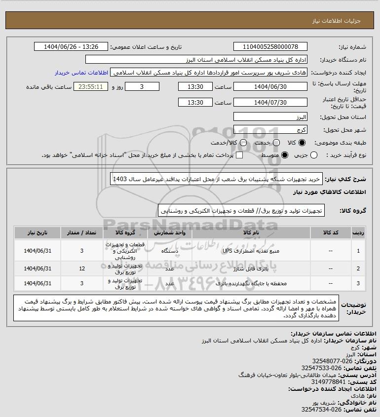 شرح کلی نیاز: خرید تجهیزات شبکه پشتیبان برق شعب از محل اعتبارات پدافند غیرعامل سال 1403