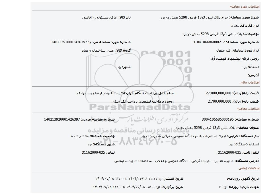 | شرح مورد معامله: حراج پلاک ثبتی 3و13 فرعی 5298 بخش دو یزد | نام کالا: اماکن مسکونی و اقامتی | |