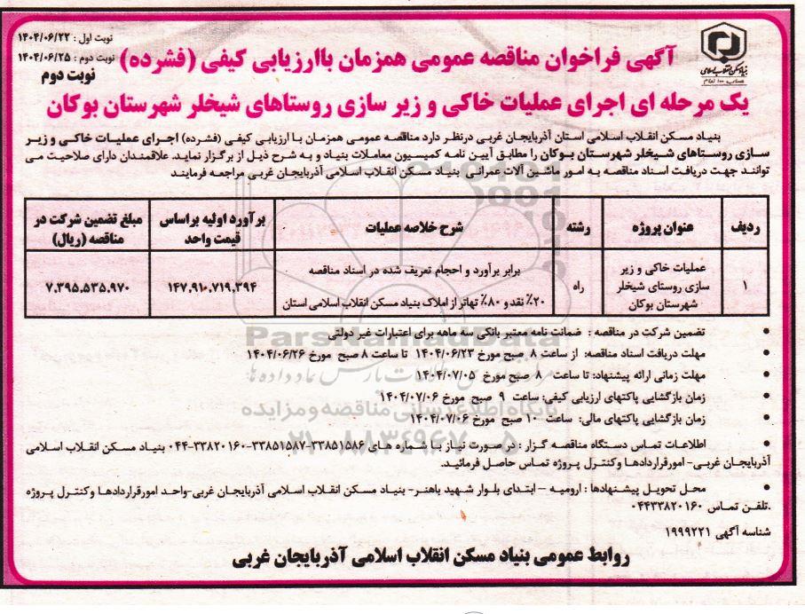| 1 | اجرای عملیات خاکی و زیرسازی روستاهای شیخلر شهرستان بوکان | راه | برابر برآورد و احجام تعریف شده در اسناد مناقصه %20 نقد و 80 درصد تهاتر از املاک بنیاد مسکن استان | 147.910.719.394 | 7.395.535.970 |