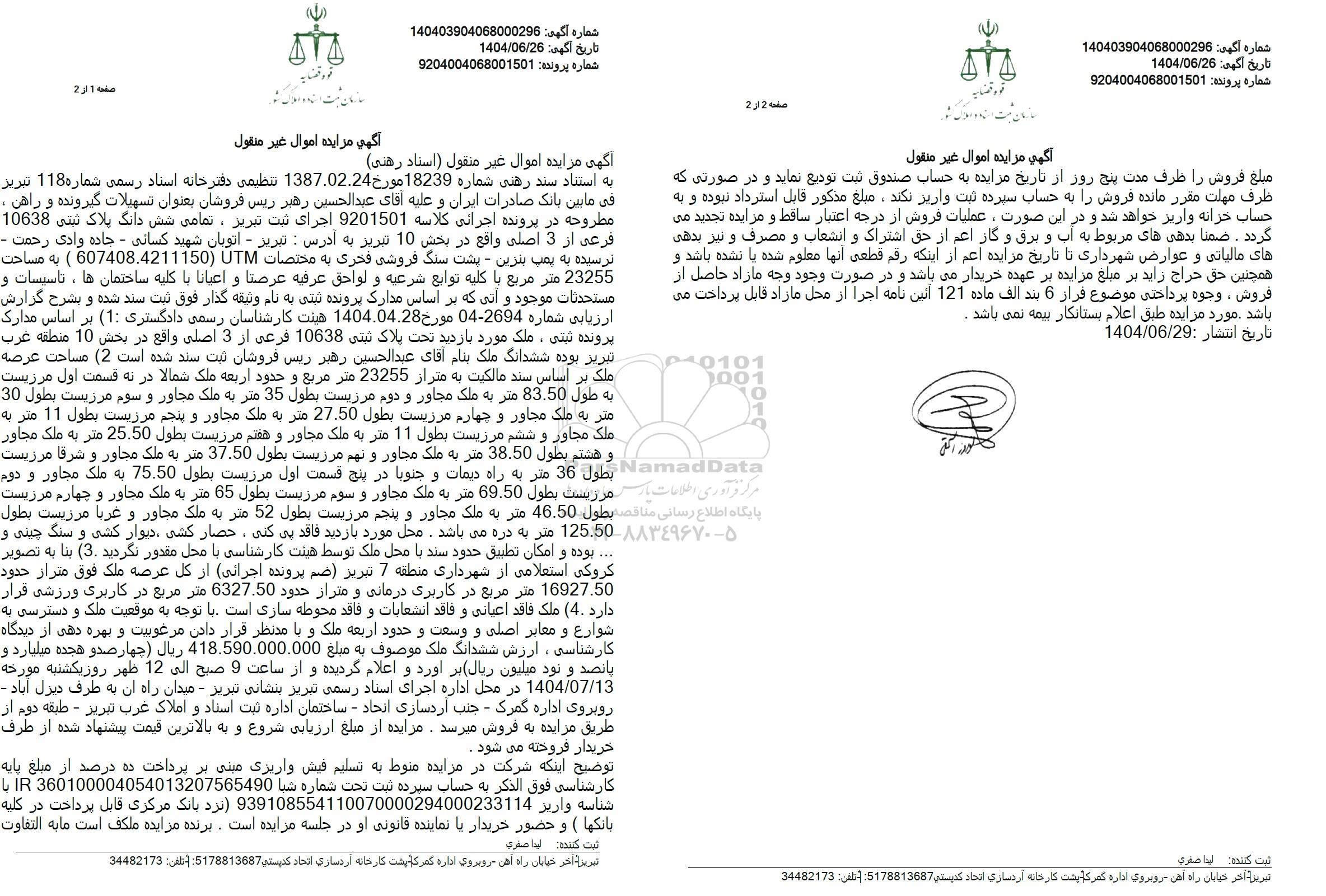 مزایده فروش ملک به پلاک ثبتی 10638 فرعی از سه اصلی بهمساحت 23255 مترمربع
