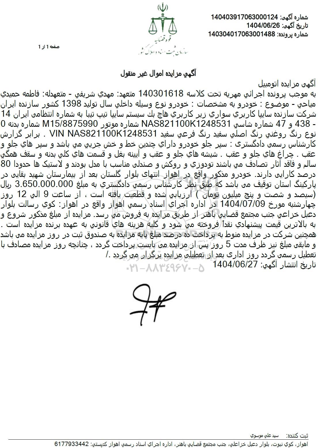 مزایده فروش یک دستگاه خودروی تیبا مدل 1398