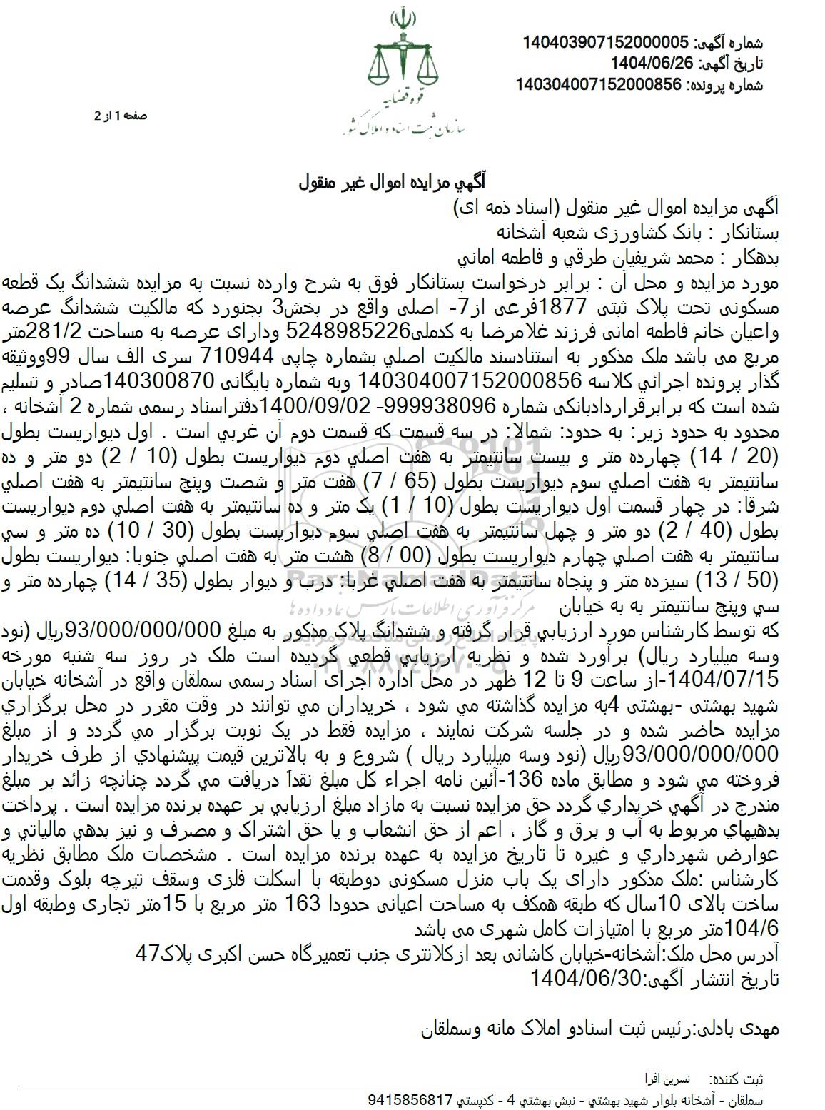 مزایده فروش ششدانگ یک قطعه مسکونی تحت پلاک ثبتی 1877 فرعی از 7 اصلی