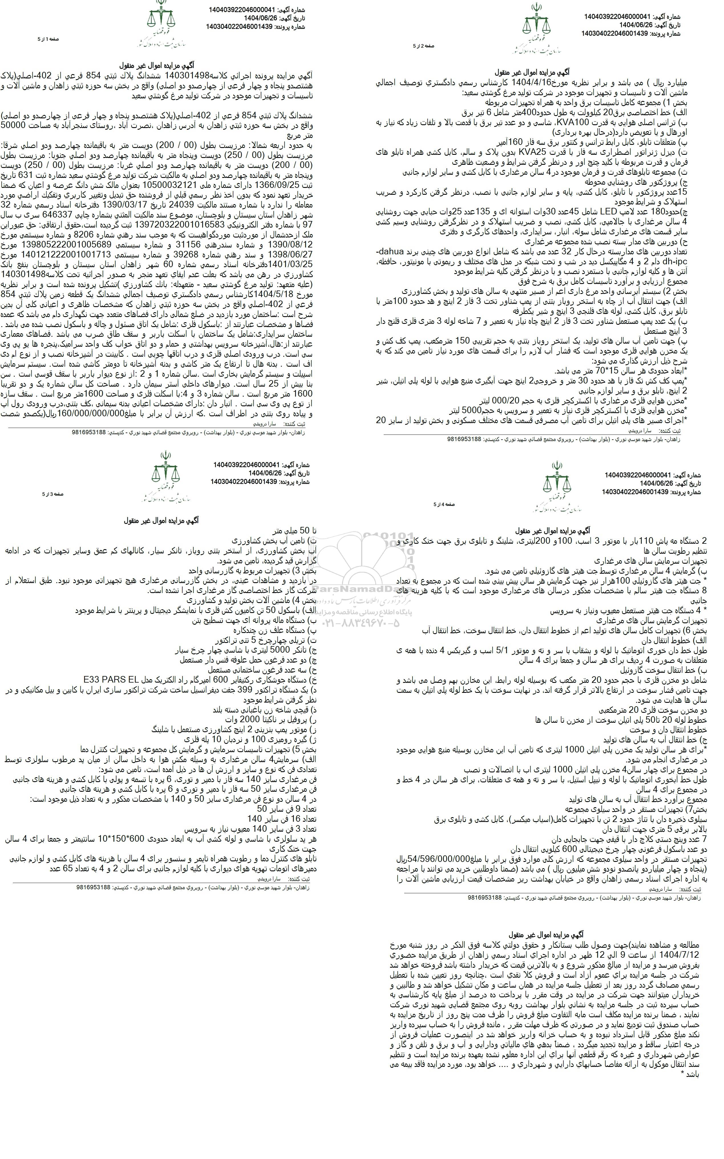 مزایده عمومی مزایده فروش ششدانگ پلاک ثبتی 854 فرعی از 402 اصلی و برگزار میگردد. از کلیه افراد متخصص و شرکت‌های واجد شرایط دعوت به عمل می‌آید تا در این مزایده با کد خبرگزاری پارس نماد : 9565173 شرکت نمایند تاریخ شروع مزایده : 1404/06/26 مهلت شرکت در مزایده: تا پایان روز 1404/07/12 مکان برگزاری اموال واگذاری استان‌های سیستان و بلوچستان و دسته‌بندی‌های مربوط به این حراجی ابزار و یراق آلات, الکتروموتور و پمپ, برق, تجهیزات کارخانه ها و ماشین آلات صنعتی, ماشین آلات و تجهیزات کشاورزی و دام پروری, دستگاه جوش و برش, کامپیوتر, لوله و اتصالات, آهن آلات, تاسیسات, جرثقیل, دیزل ژنراتور, ماشین های پرس و قیچی, ماشین آلات سنگین و نیمه سنگین, متفرقه, املاک و زمین میباشد.