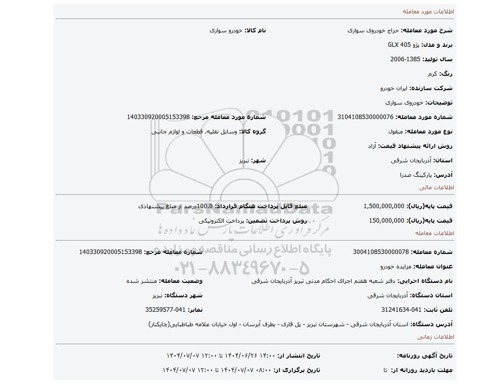 | شرح مورد معامله: حراج خودروی سواری | نام کالا: خودرو سواری | |