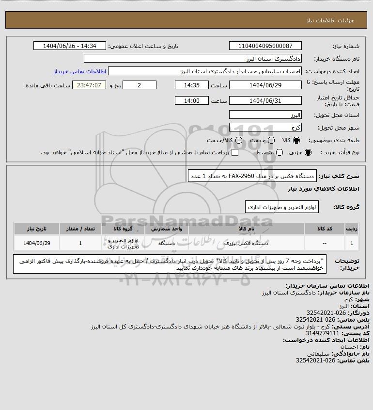 شرح کلی نیاز: دستگاه فکس برادر مدل FAX-2950 به تعداد 1 عدد