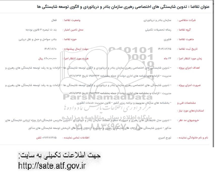 علاقه‌مندان می‌توانند جهت دریافت اسناد و اطلاعات تکمیلی، فراخوان تدوین شایستگی های اختصاصی رهبری سازمان بنادر و دریانوردی و الگوی توسعه شایستگی ها با سامانه مناقصات و مزایدات ایران پارس‌نماد داده ها 88349670 تماس حاصل نمایند.