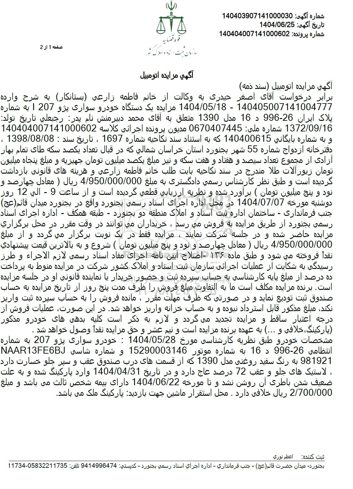 مزایده عمومی مزایده یک دستگاه خودرو سواری پژو 207 برگزار میگردد. از کلیه افراد متخصص و شرکتهای واجد شرایط دعوت به عمل میآید تا در این مزایده با کد خبرگزاری پارس نماد : 9565340 شرکت نمایند تاریخ شروع مزایده : 1404/06/26 مهلت شرکت در مزایده: تا پایان روز 1404/07/07 مکان برگزاری اموال واگذاری استانهای خراسان شمالی و دستهبندیهای مربوط به این حراجی انواع خودرو سبک میباشد.