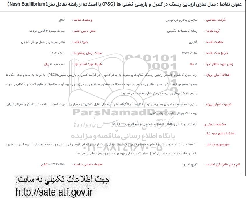 علاقه‌مندان می‌توانند جهت دریافت اسناد و اطلاعات تکمیلی، فراخوان مدل سازی ارزیابی ریسک در کنترل و بازرسی کشتی ها (PSC) با استفاده از رابطه تعادل نش (Nash Equilibrium) با سامانه مناقصات و مزایدات ایران پارس‌نماد داده ها 88349670 تماس حاصل نمایند.
