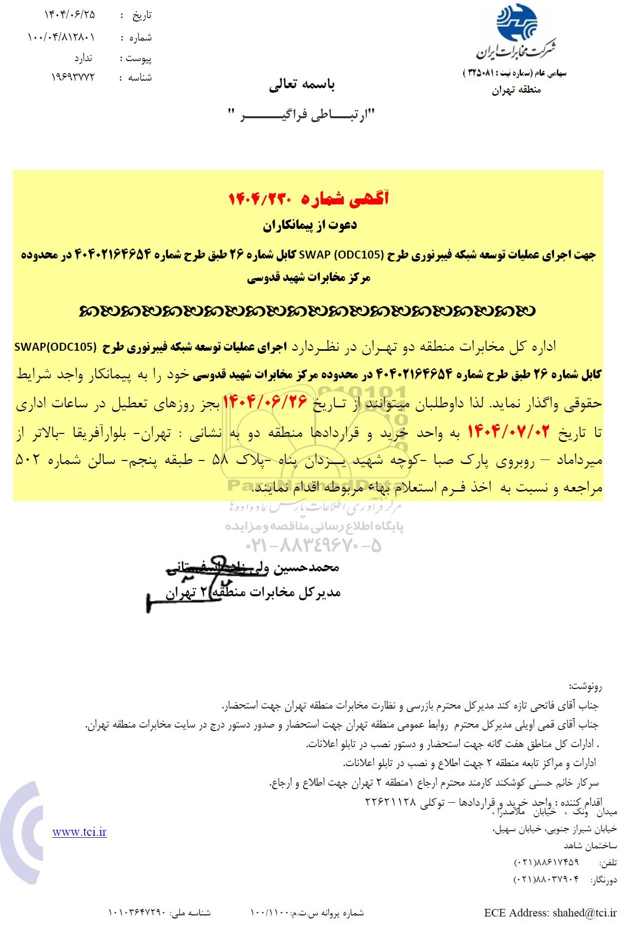 اداره کل مخابرات منطقه دو تهران در نظر دارد اجرای توسعه شبکه فیبر نوری طرح SWAP (ODC105) کابل شماره 26 طبق طرح شماره 40402164654 در محدوده مرکز مخابرات شهید قدوسی خود را به پیمانکار واجد شرایط حقوقی واگذار نماید لذا داوطلبان میتوانند از تاریخ 1404.06.26 بجز روزهای تعطیل در ساعات اداری تا تاریخ 1404.07.02 به واحد خرید و قراردادها منطقه دو به نشانی : تهران بلوار آفریقا بالاتر از میرداماد - روبروی پارک صبا کوچه شهید یزدان پناه - پلاک 58 - طبقه پنجم سالن شماره 502 مراجعه و نسبت به اخذ فرم استعلام بهاء مربوطه اقدام نمایند.