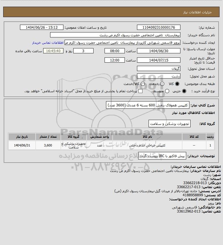 نام دستگاه خریدار:بیمارستان تامین اجتماعی حضرت رسول اکرم ص رشت