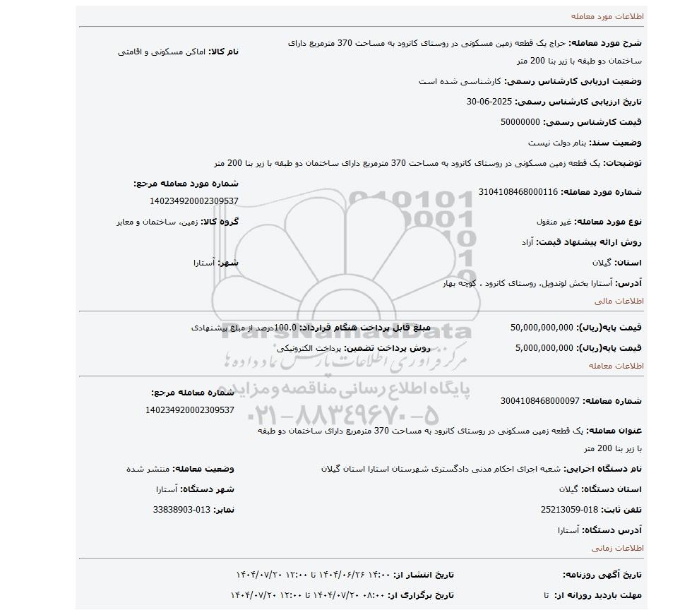 | شرح مورد معامله: حراج یک قطعه زمین مسکونی در روستای کانرود به مساحت 370 مترمربع دارای ساختمان دو طبقه با زیر بنا 200 متر | نام کالا: اماکن مسکونی و اقامتی | |