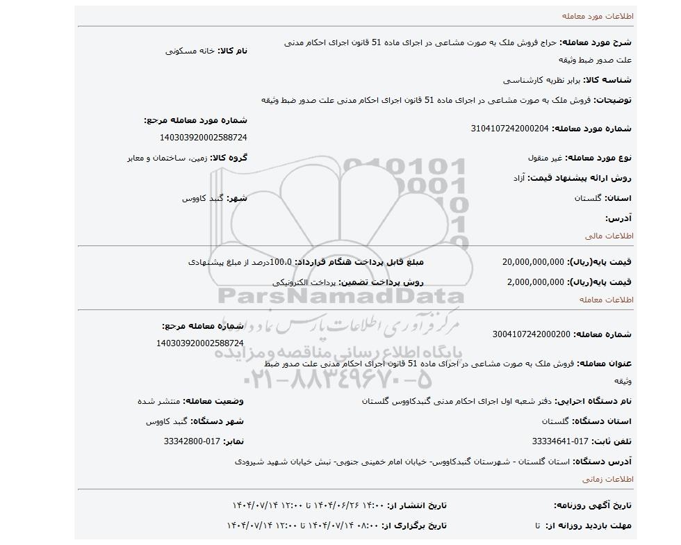 | عنوان معامله: فروش ملک به صورت مشاعی در اجرای ماده 51 قانون اجرای احکام مدنی علت صدور ضبط وثیقه | ||