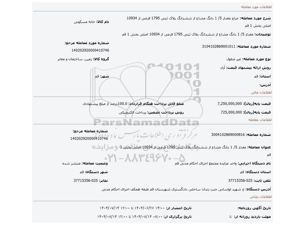 | شرح مورد معامله: حراج مقدار 5/ 1 دانگ مشاع از ششدانگ پلاک ثبتی 1795 فرعی از 10934 اصلی بخش 1 قم | نام کالا: خانه مسکونی | |