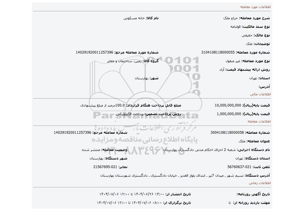 | شماره مورد معامله: 3104108118000055 | شماره مورد معامله مرجع: 140291920011257396 | |