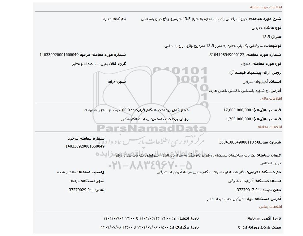 | نام دستگاه اجرایی: دفتر شعبه اول اجرای احکام مدنی مراغه آذربایجان شرقی | وضعیت معامله: منتشر شده | |