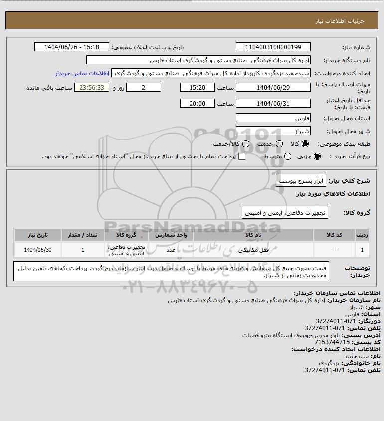 | 1 | -- | قفل مکانیکی | عدد | تجهیزات دفاعی، ایمنی و امنیتی | 1 | 1404/06/30 |