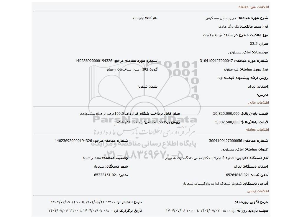 | شرح مورد معامله: حراج اماکن مسکونی | نام کالا: آپارتمان | |