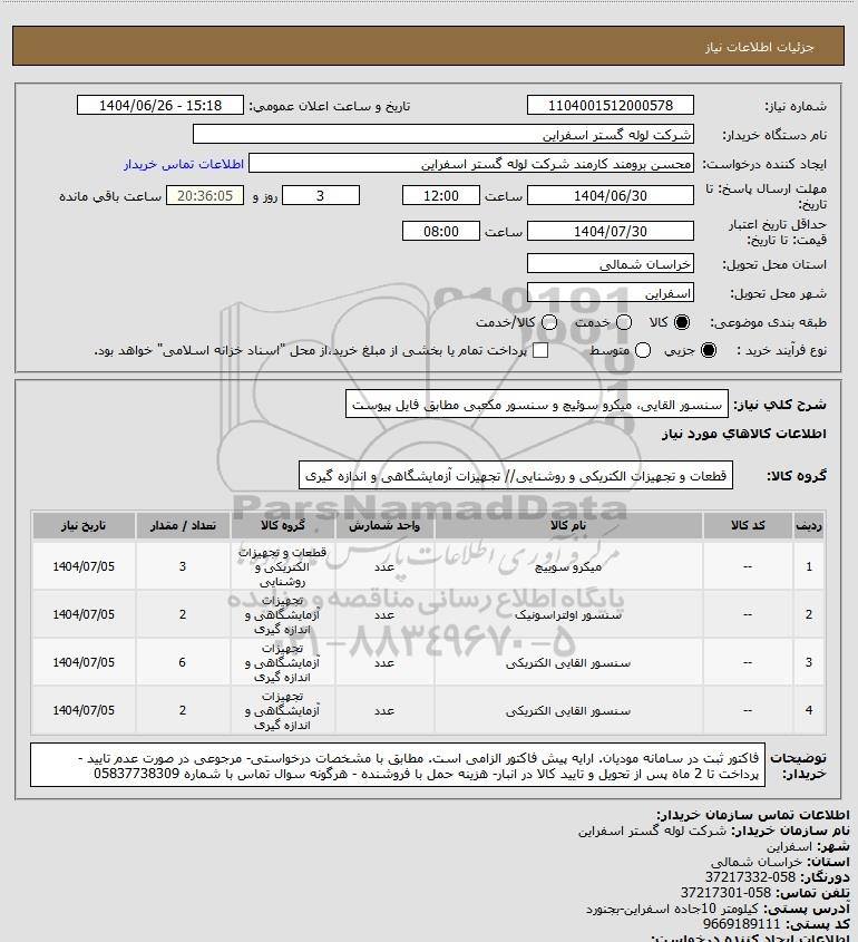 | 4 | -- | سنسور القایی الکتریکی | عدد | تجهیزات آزمایشگاهی و اندازه گیری | 2 | 1404/07/05 |