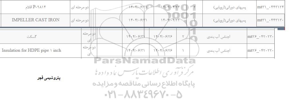 | MT26- 0420220 | اجناس آب بندی | 1 | 1404.6.31 | دو مرحله ای | INSULATION HDPE PIPE 1 INCH |