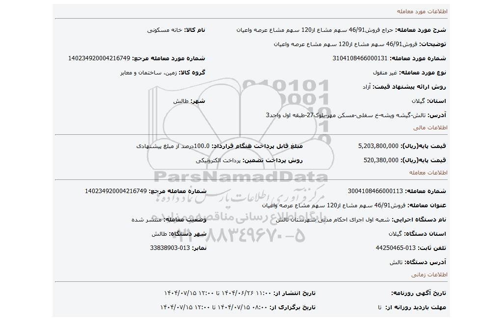 | عنوان معامله: فروش46/91 سهم مشاع از120 سهم مشاع عرصه واعیان | ||