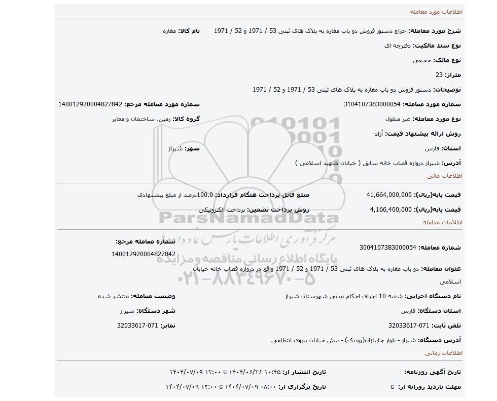 | شرح مورد معامله: حراج دستور فروش دو باب مغازه به پلاک های ثبتی 53 / 1971 و 52 / 1971 | نام کالا: مغازه | |