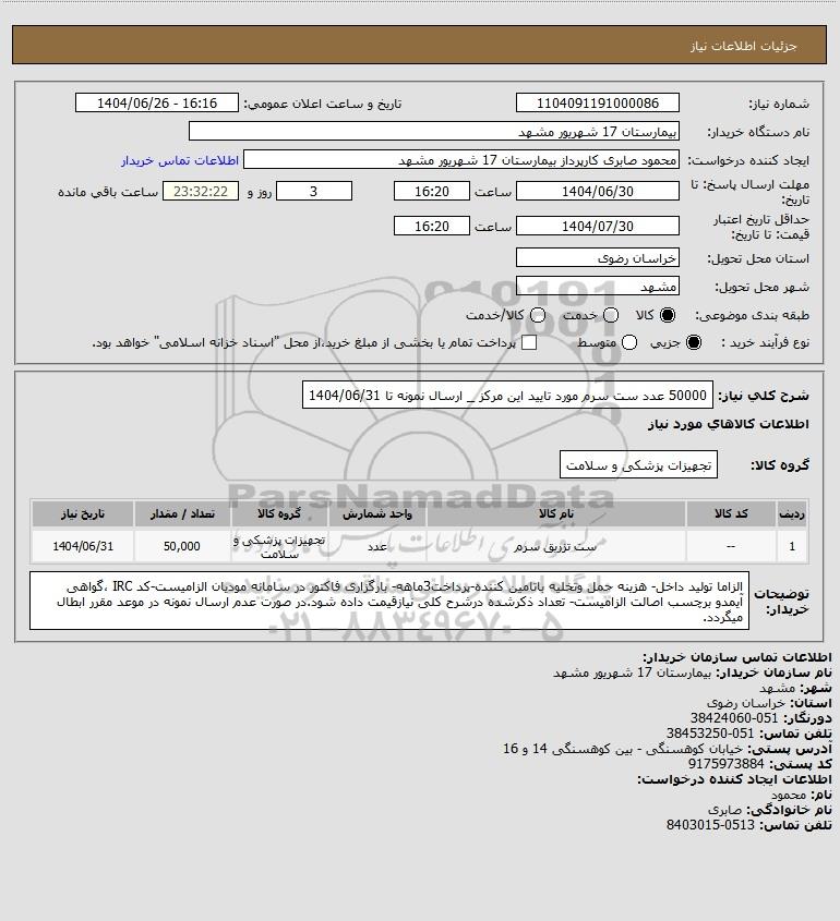 شرح کلی نیاز: 50000 عدد ست سرم مورد تایید این مرکز _ ارسال نمونه تا 1404/06/31