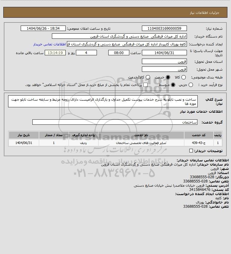 شرح کلی نیاز: ساخت و نصب تابلو به شرح خذمات پیوست تکمیل جداول و بارگذاری الزامیست دارای رزومه مرتبط و سابقه ساخت تابلو جهت موزه ها