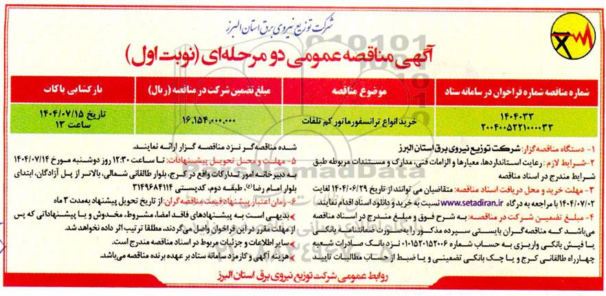 1. دستگاه مناقصه گزار : شرکت توزیع نیروی برق استان البرز