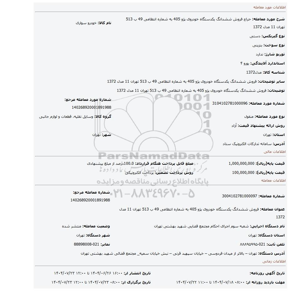 عنوان معامله: فروش ششدانگ یکدستگاه خودروی پژو 405 به شماره انتظامی 49 ب 513 تهران 11 مدل 1372