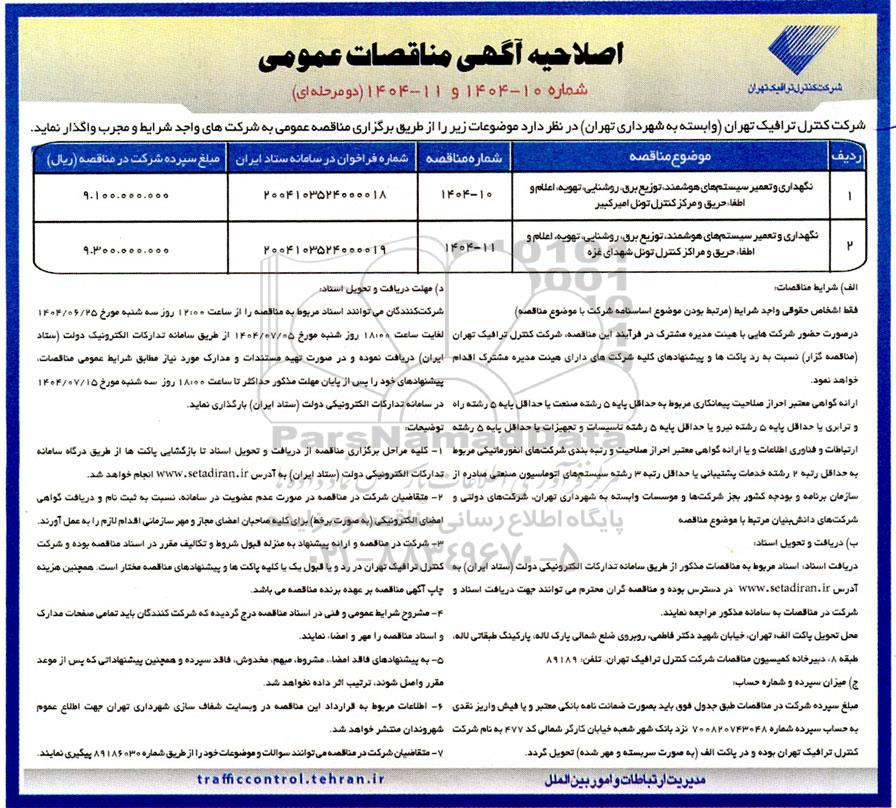 | 2 | نگهداری و تعمیر سیستم های هوشمند توزیع برق ، روشنایی ، تهویه اعلام و اطفاء حریق و مرکز کنترل تونل شهدای غزه | 1404-11 | 2004103524000019 | 9.300.000.000 |