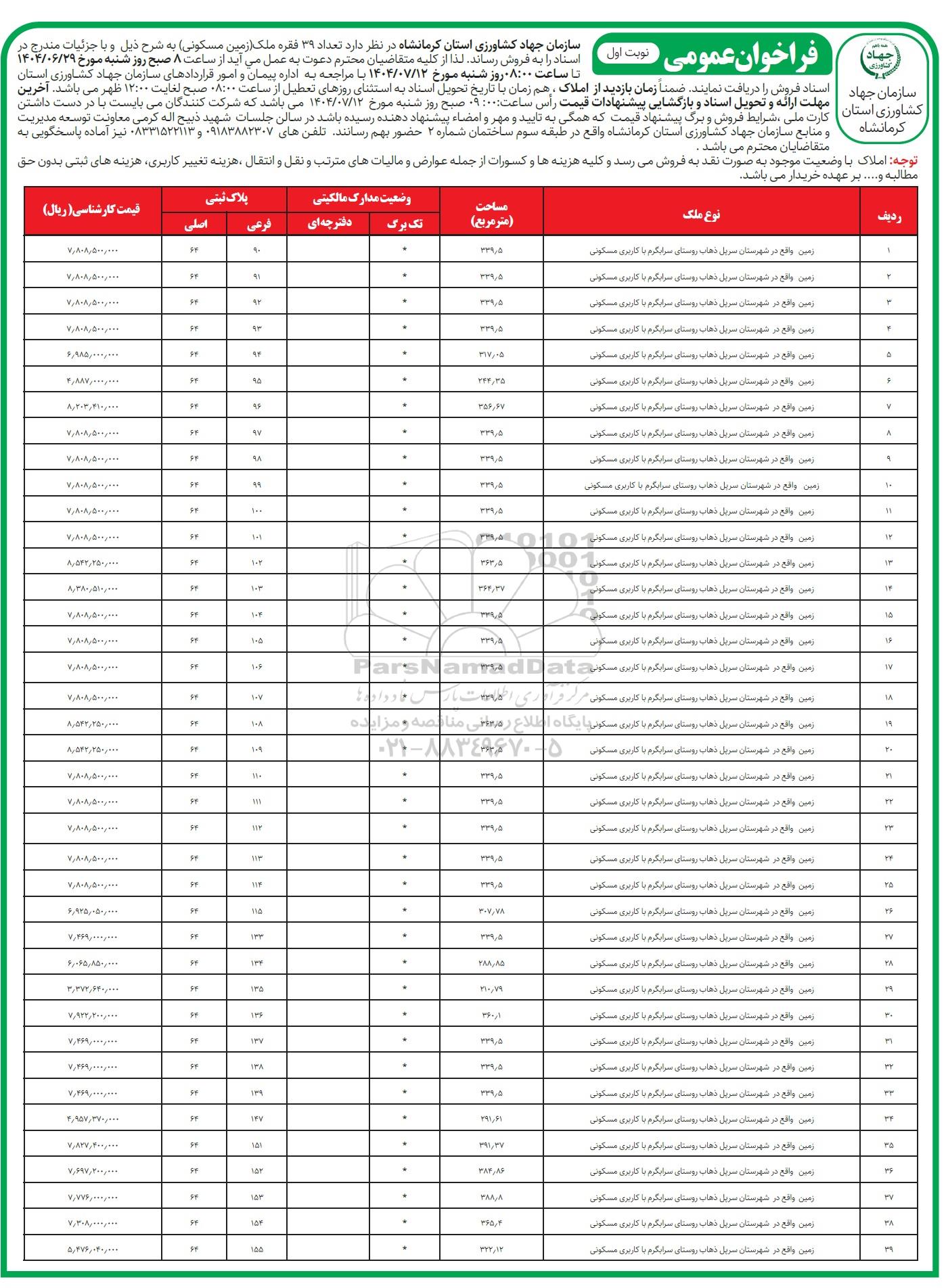 سازمان جهاد کشاورزی استان کرمانشاه در نظر دارد تعداد 39 فقره ملک را به شرح ذیل با جزئیات مندرج در استاد مزایده و بهره گیری از سامانه تدارکات الکترونیکی دولت ستاد ایران از طریق مزایده عمومی به فروش رساند. لذا از کلیه متقاضیان محترم دعوت به عمل می آید. از ساعت 8 صبح روز شنبه مورخ 1404.6.29 زمان انتشار در سایت، تا ساعت 8 روز شنبه مورخ 1404.7.12
