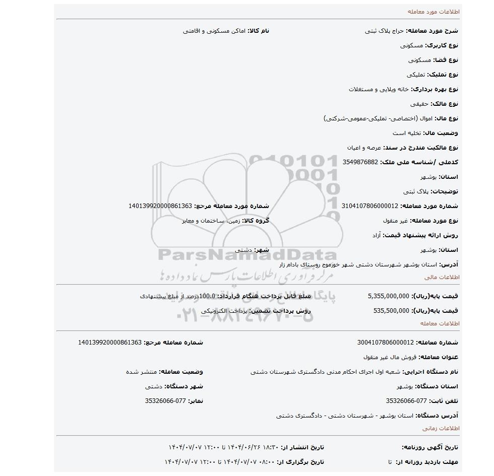 | شرح مورد معامله: حراج پلاک ثبتی | نام کالا: اماکن مسکونی و اقامتی | |