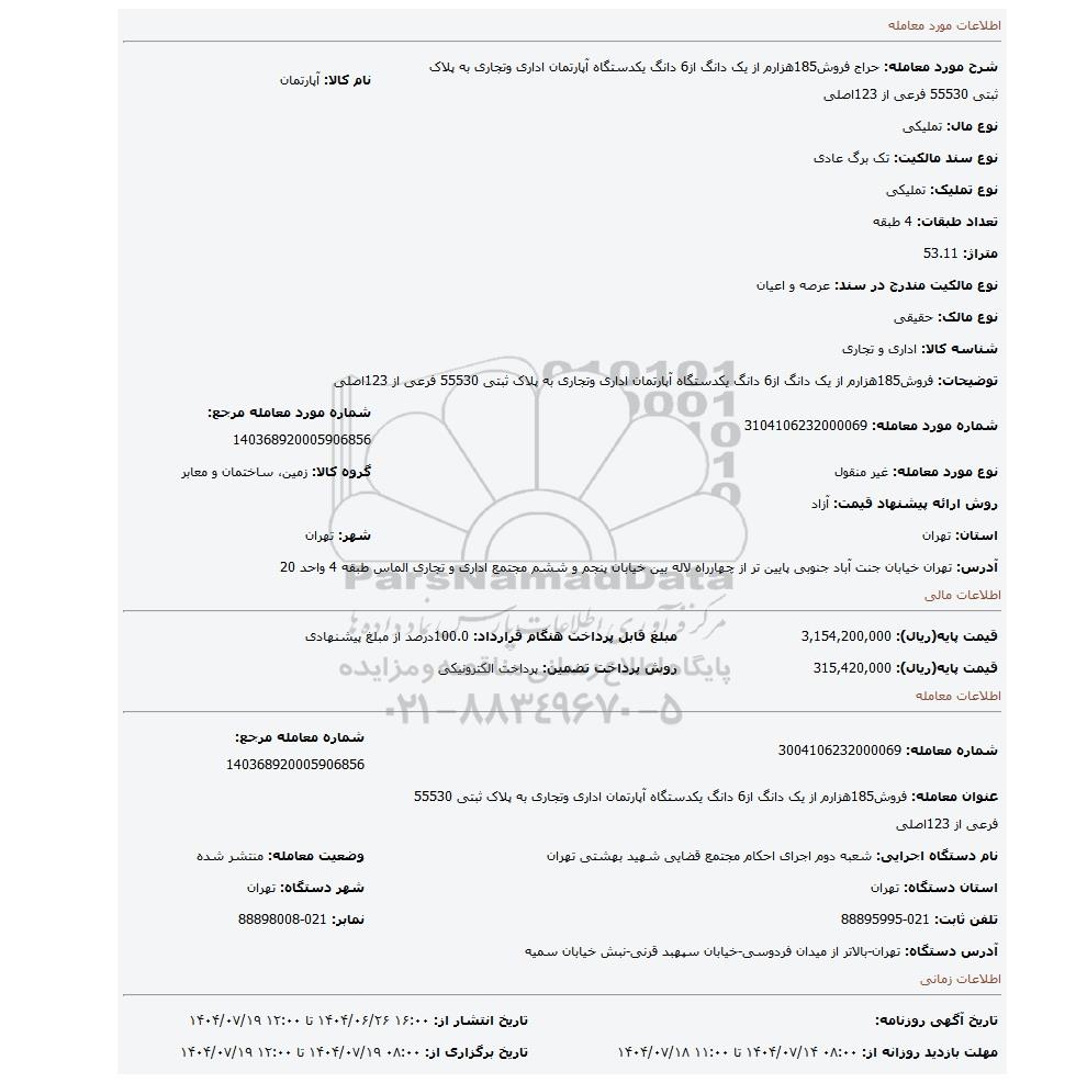 | شرح مورد معامله: حراج فروش185هزارم از یک دانگ از6 دانگ یکدستگاه آپارتمان اداری وتجاری به پلاک ثبتی 55530 فرعی از 123اصلی | نام کالا: آپارتمان | |