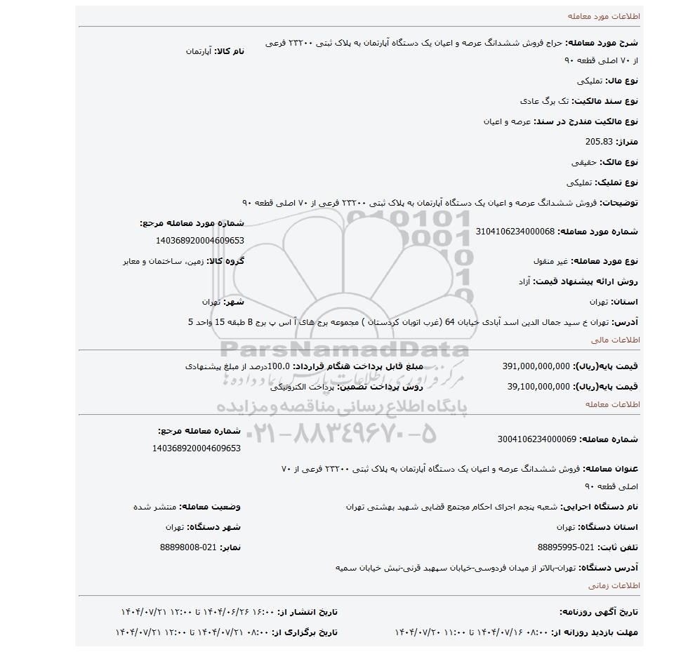 عنوان معامله: فروش ششدانگ عرصه و اعیان یک دستگاه آپارتمان به پلاک ثبتی ۲۳۲۰۰ فرعی از ۷۰ اصلی قطعه ۹۰
