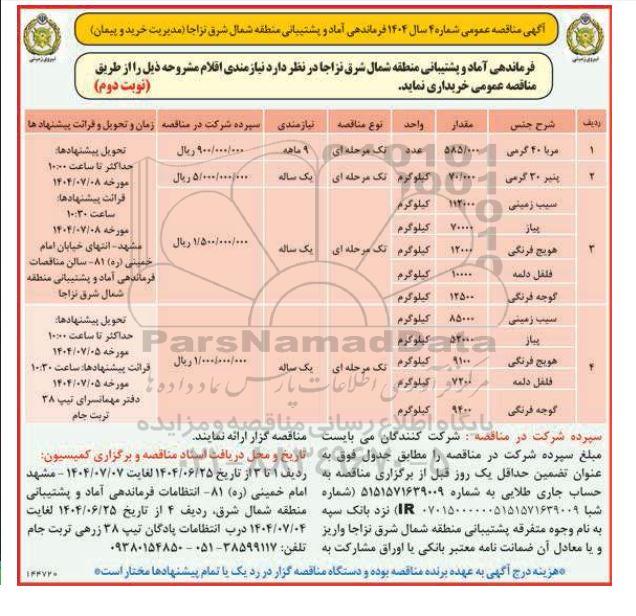 آگهی مناقصه عمومی شماره 4 سال 1404 فرماندهی آماد و پشتیبانی منطقه شمال شرق نزاجا (مدیریت خرید و پیمان)