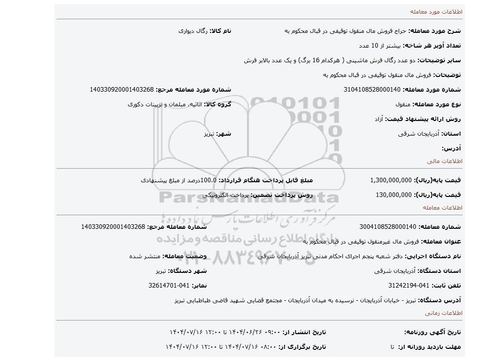 نام دستگاه اجرایی: دفتر شعبه پنجم اجرای احکام مدنی تبریز آذربایجان شرقیوضعیت معامله: منتشر شده