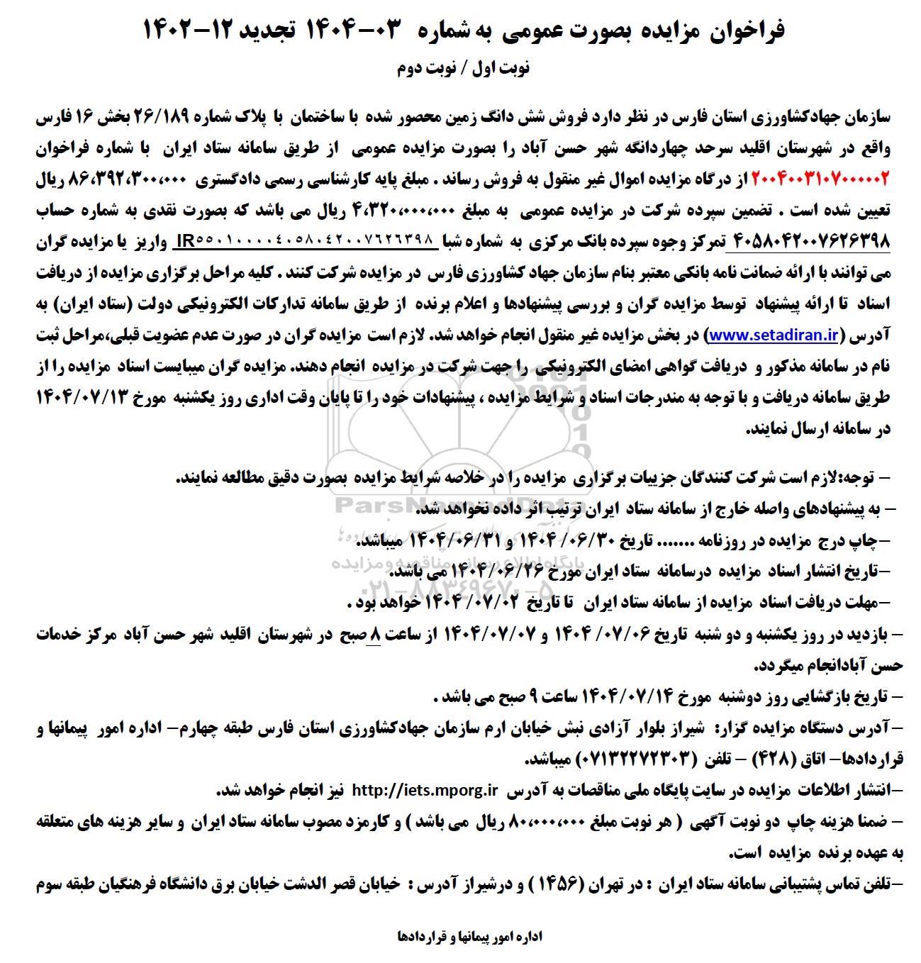 سازمان جهاد کشاورزی استان فارس در نظر دارد فروش شش دانگ زمین محصور شده با ساختمان با پلاک شماره 26.189 بخش 16  فارس واقع در شهرستان اقلید سرحد چهاردانگه شهر حسن آباد را بصورت مزایده عمومی از طریق سامانه ستاد ایران با شماره فراخوان 2004003107000002 از درگاه مزایده اموال غیر منقول به فروش رساند. مبلغ پایه کارشناسی رسمی دادگستری86.392.300.000 ریال تعیین شده است. تضمین سپرده شرکت در مزایده عمومی به مبلغ 4.320.000.000 ریال میباشد که بصورت نقدی به شماره حساب 4058042007626398 تمرکز وجوه سپرده بانک مرکزی به شماره شبا IR550100004058042007626398 واریز یا مزایده گران می توانند با ارائه ضمانت نامه بانکی معتبر بنام سازمان جهاد کشاورزی فارس در مزایده شرکت کنند . کلیه مراحل برگزاری مزایده از دریافت اسناد تا ارائه پیشنهاد توسط مزایده گران و بررسی پیشنهادها و اعلام برنده از طریق سامانه تدارکات الکترونیکی دولت ستاد ایران به آدرس ستاد ایران در بخش مزایده غیر منقول انجام خواهد شد. لازم است مزایده گران در صورت عدم عضویت قبلی مراحل ثبت نام در سامانه مذکور و دریافت گواهی امضای الکترونیکی را جهت شرکت در مزایده انجام دهند مزایده گران میبایست اسناد مزایده را از طریق سامانه دریافت و با توجه به مندرجات اسناد و شرایط مزایده ، پیشنهادات خود را تا پایان وقت اداری روز یکشنبه مورخ 1404.7.13 در سامانه ارسال نمایند.