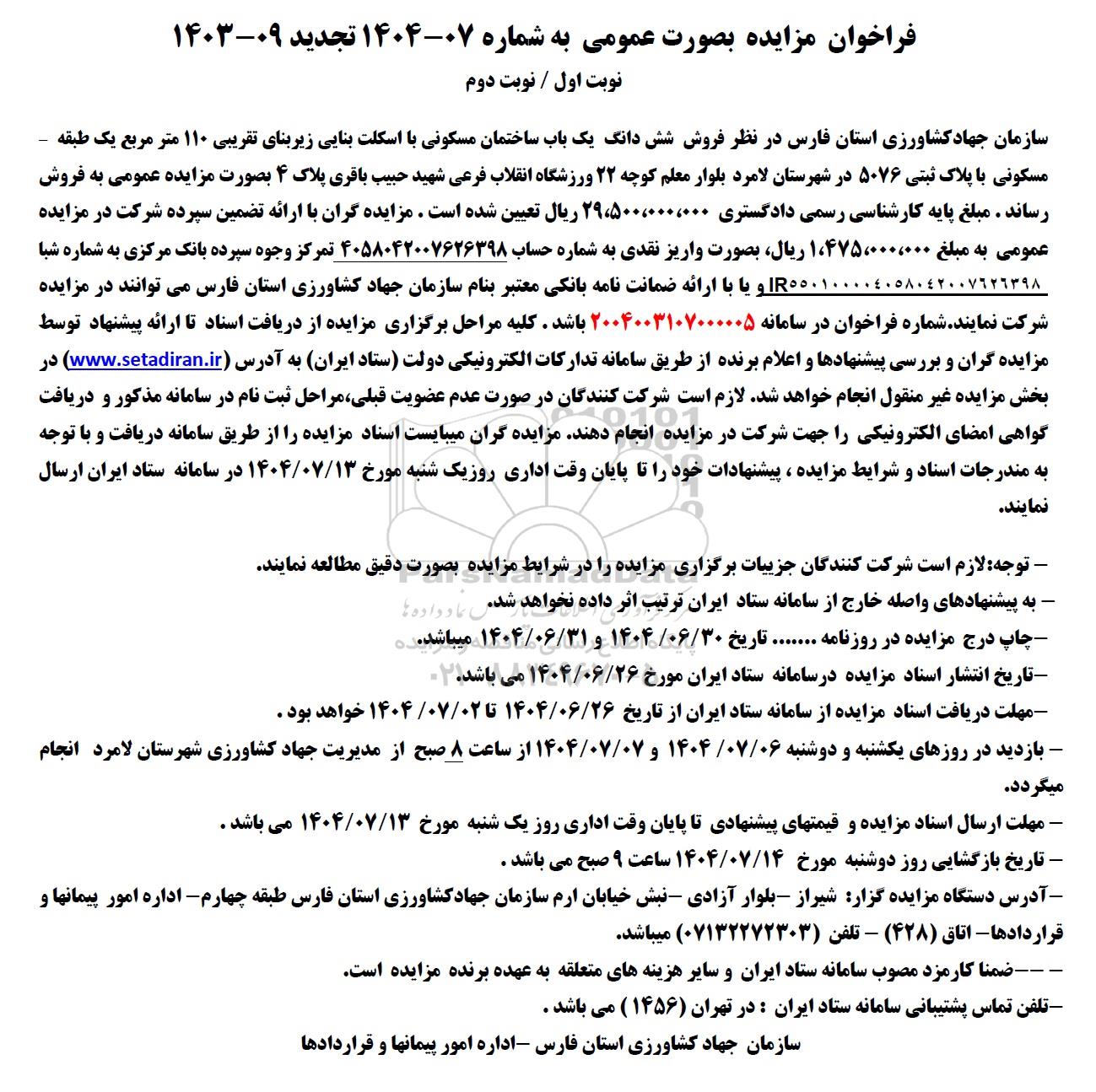 سازمان جهاد کشاورزی استان فارس در نظر دارد فروش ششدانگ یک باب ساختمان مسکونی با اسکلت بنایی زیربنای تقریبی 110 مترمربع یک طبقه مسکونی با پلاک ثبتی 5076 در شهرستان لامرد بلوار معلم کوچه 22 ورزشگاه انقلاب فرعی شهید حبیب باقری پلاک 4
