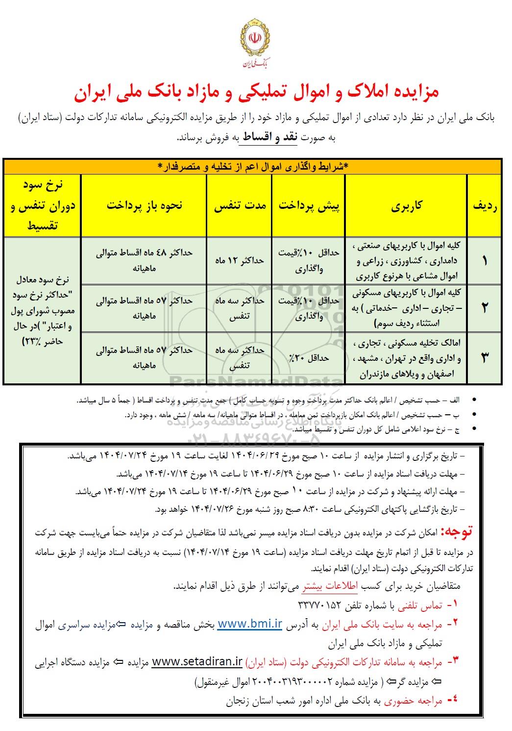 مزایده املاک و اموال تملیکی و مازاد بانک ملی ایران ؟