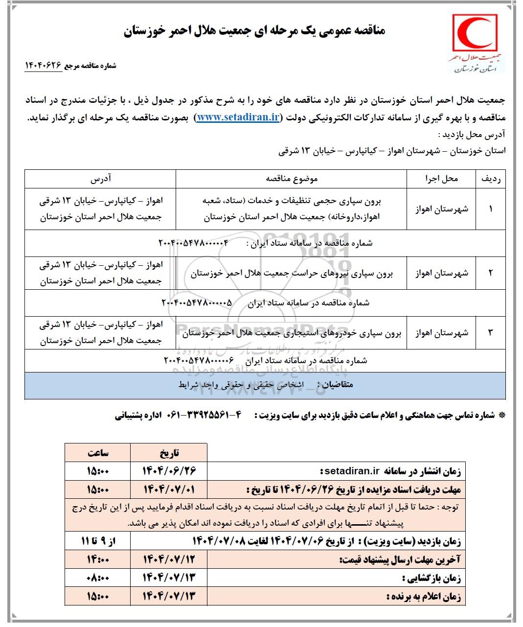جمعیت هلال احمر استان خوزستان در نظر دارد مناقصه های خود را به شرح مذکور در جدول ذیل با جزییات مندرج در اسناد مناقصه و با بهره گیری از سامانه تدارکات الکترونیک دولت ستاد ایران به صورت مناقصه دومرحله ای فشرده واگذار نماید.